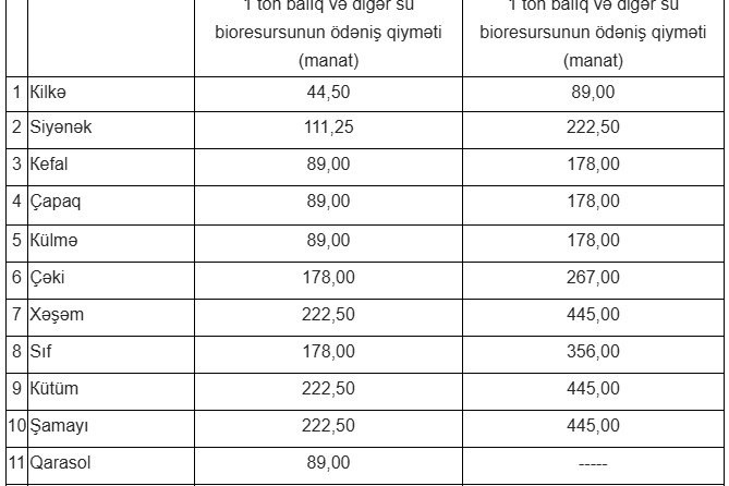 2026-cı ildə balıq və digər su bioresurslarının sənaye, əmtəə məqsədilə akvakultura, təhsil və maarifləndirmə məqsədilə ovuna görə Azərbaycan Respublikasının və xarici dövlətlərin hüquqi və fiziki şəxsləri üçün müəyyən edilmiş ödəniş qiymətləri: