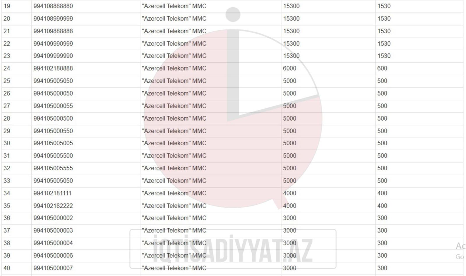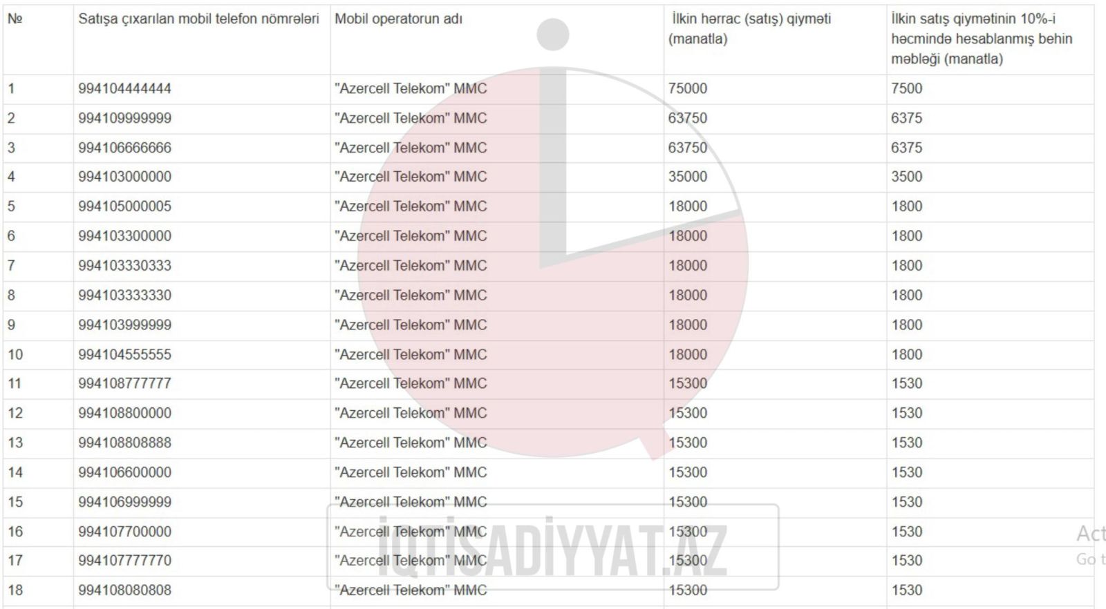 Satışa çıxarılan 64 mobil nömrənin ilkin satış qiyməti 800 manatdan 75.000 manatadək dəyişir.