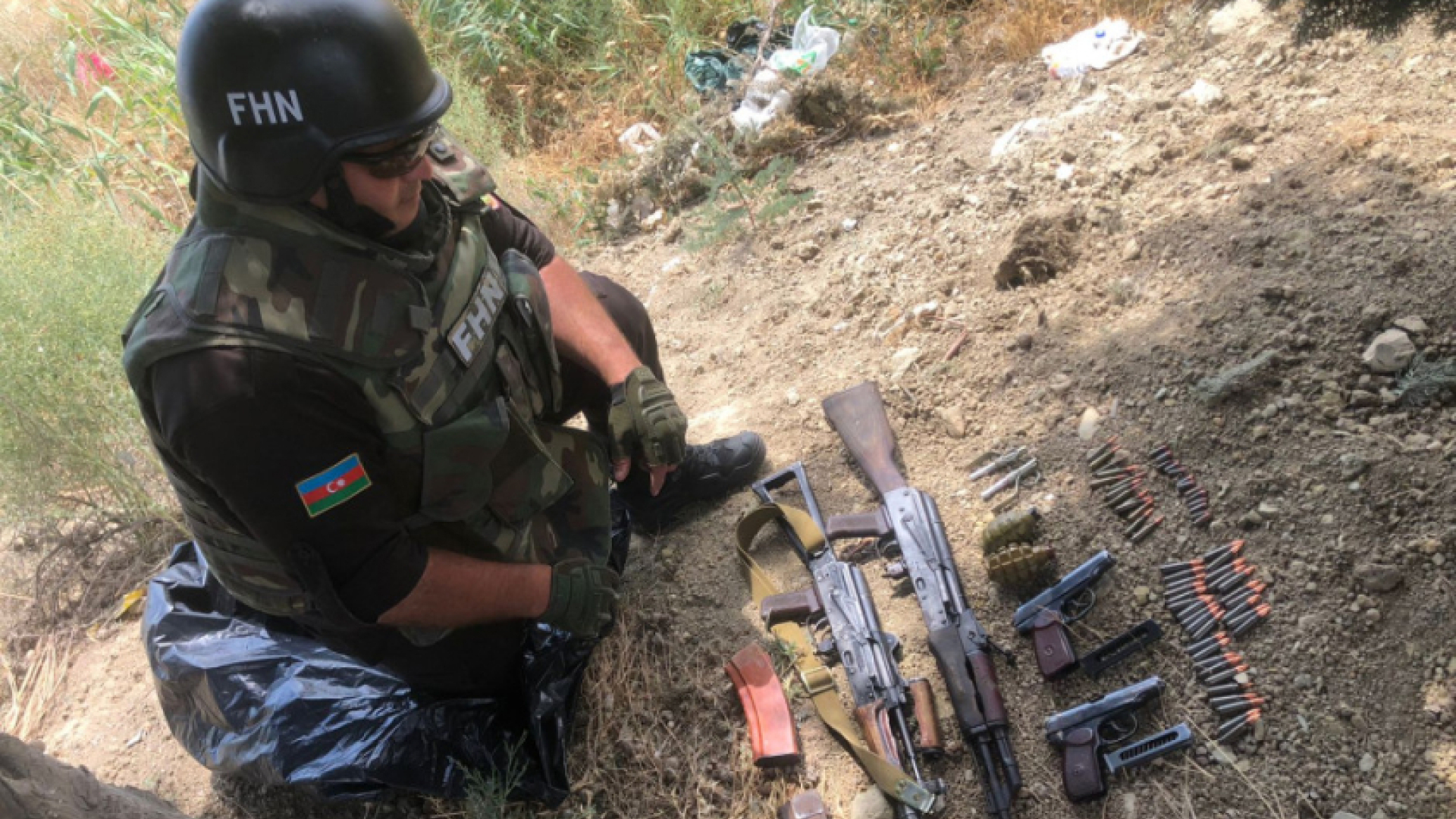 Sumqayit24.az xəbər verir ki, Fövqəladə Hallar Nazirliyinin (FHN) Xüsusi Riskli Xilasetmə Xidmətinin (XRXX) minalardan təmizləmə üzrə çevik qrupu tərəfindən Novxanı ilə yanaşı Məmmədli kəndi və Masazır qəsəbəsində aşkarlanan silah-sursatların döyüş tətbiqinə yararlı 17 ədəd F-1 əl qumbarası, 16 ədəd UZRQM partladıcısı, 1 ədəd UBR-M75P1 partladıcısı, 85 ədəd 7,62 millimetrlik, 44 ədəd 5,45 millimetrlik və 13 ədəd 9,18 millimetrlik mərmi, 1 ədəd AK-74 avtomatı və 2 ədəd sandıqcası, 1 ədəd AKSU avtomatı, 2 ədəd “Makarov” tipli tapança və 2 ədəd sandıqcası, 1 ədəd süngü bıçağı olduğu müəyyən edilib.