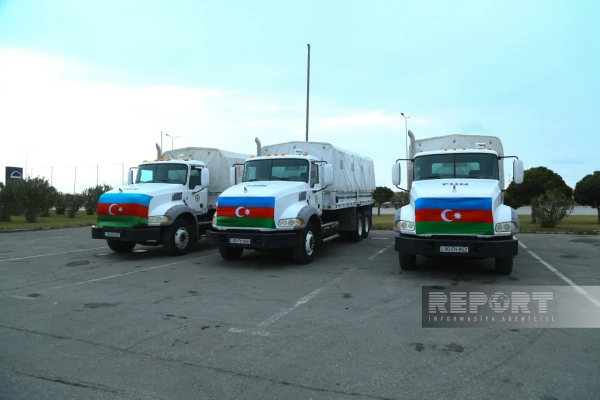 Report.az-ın məlumatına görə, Azərbaycan Prezidentinin tapşırığına uyğun olaraq Fövqəladə Hallar Nazirliyinin avtomobilləri ilə İrana yola salınan humanitar yardıma 10 ton un, 6 ton düyü, 2,4 ton şəkər, 4 tondan artıq su, 600 kq-a yaxın çay, 2 tona yaxın dərman və tibbi ləvazimatlar daxildir.