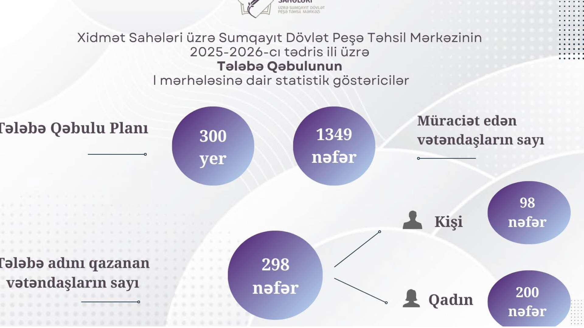 Sumqayit24.az xəbər verir ki, statistik göstəricilərə əsasən, mərkəzdə 300 yerlik qəbul planı təsdiqlənib. Ümumi olaraq 1349 nəfər müraciət edib. Qəbul imtahanlarının nəticələrinə görə, 298 nəfər tələbə adını qazanıb.