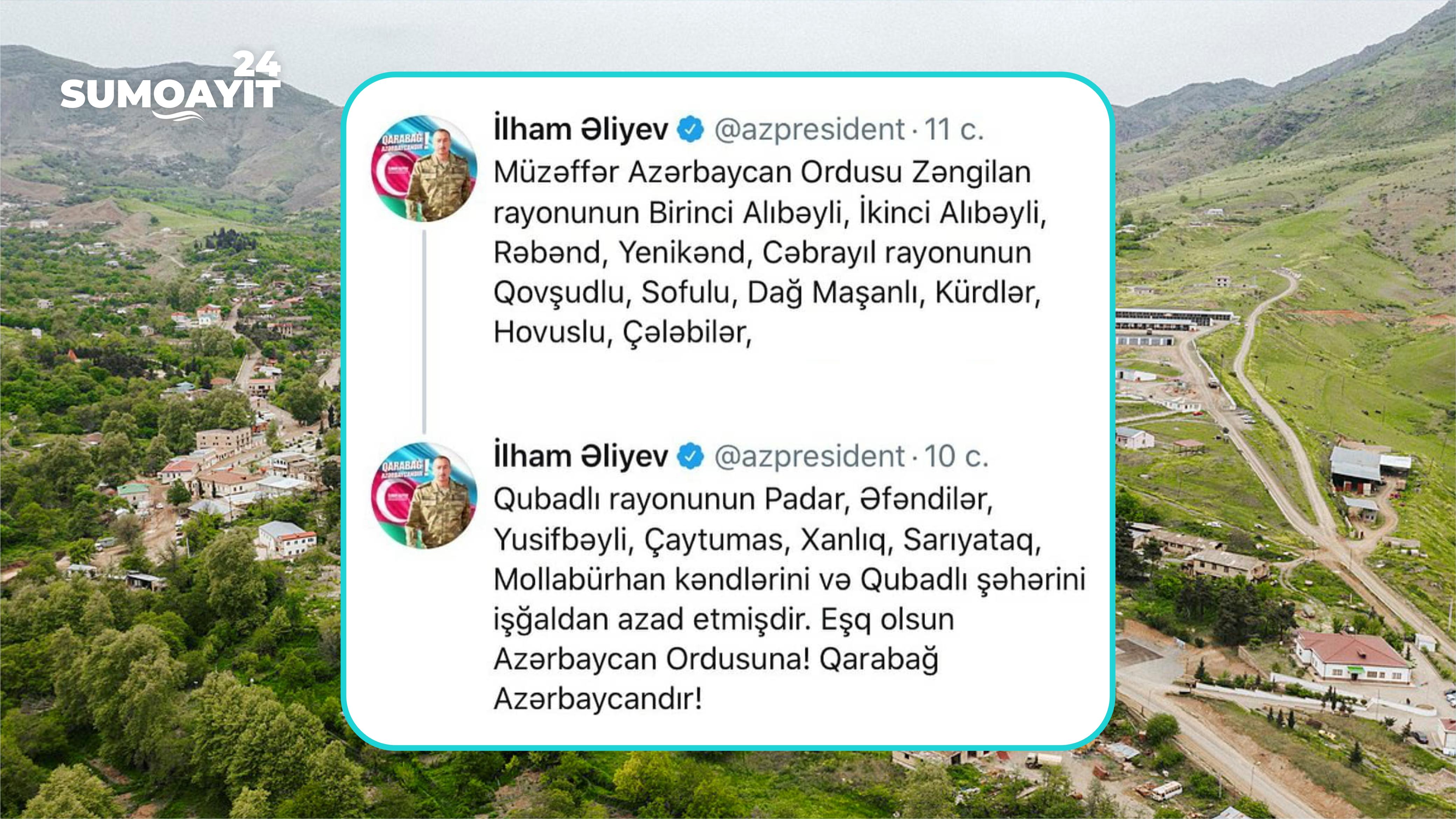 Azərbaycan Ordusu Zəngilan, Cəbrayıl, Qubadlı rayonlarının bir neçə kəndini və Qubadlı şəhərini işğalçılardan azad edib. Bu barədə Prezident İlham Əliyev özünün rəsmi “X” səhifəsində bildirib.