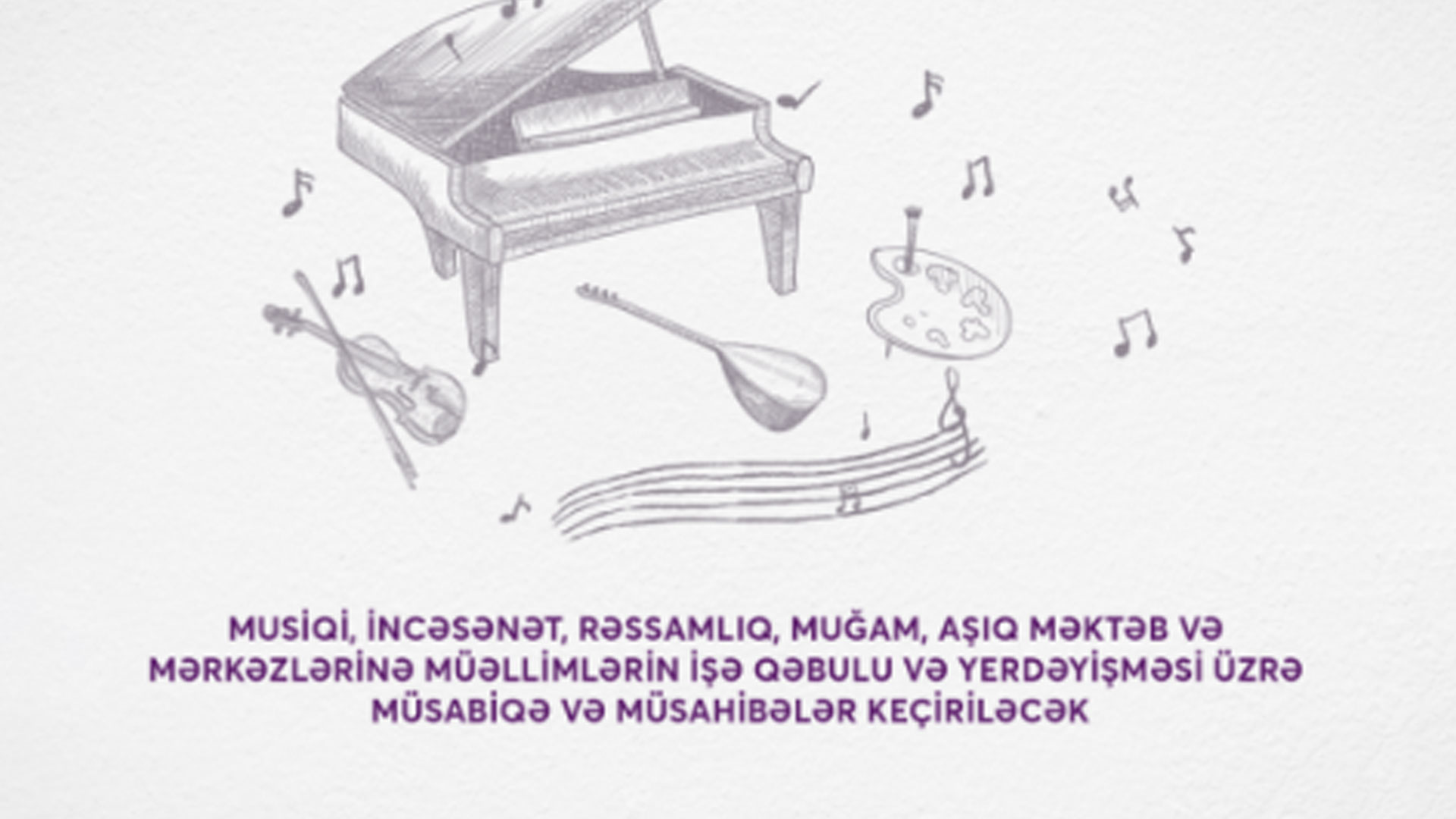 Mədəniyyət Nazirliyi müsabiqə həyata keçirəcək. Müsabiqə test imtahanından və müsahibədən ibarət olacaq. Qurumun tabeliyindəki məktəb və mərkəzlərdə müəllimlərin işə qəbulla bağlı müsabiqə şərtləri ərazilər üzrə fərqlənir. Digər ərazilərdən Bakı şəhərinə, hər hansı bir rayondan Abşeron rayonuna, Gəncə və Sumqayıt şəhərlərinə yerdəyişmə müsahibə yolu ilə həyata keçirilir.