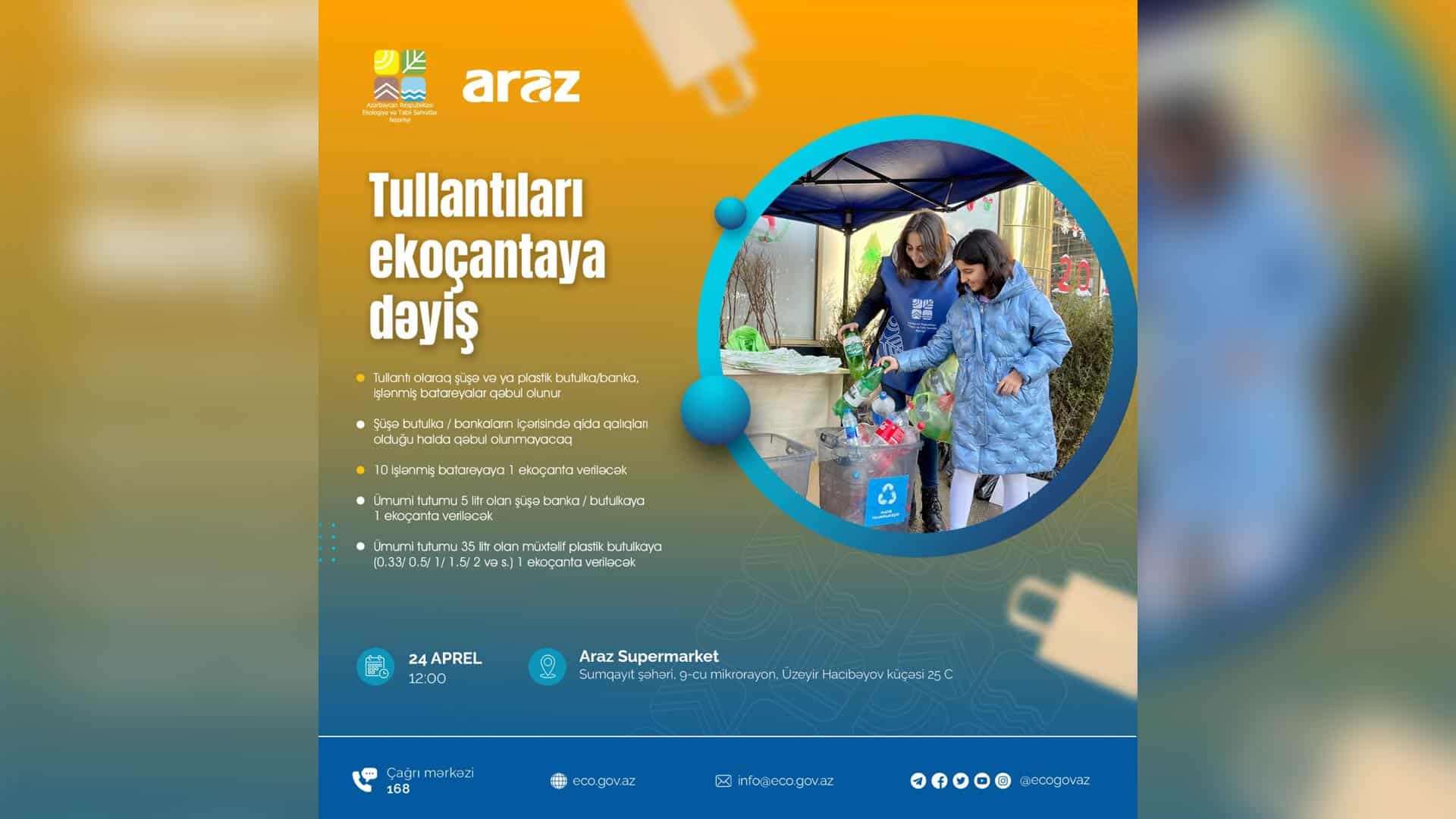 Aksiyanı Ekologiya və Təbii Sərvətlər Nazirliyi (ETSN) və “Araz” marketlər şəbəkəsi təşkil edir. Vətəndaşlar ümumi tutumu minimum 35 litr olan plastik butulka, 5 litr tutumu olan şüşə butulka/banka və ya 10 ədəd işlənmiş batareya təhvil verərək ekoçanta əldə edəcəklər.