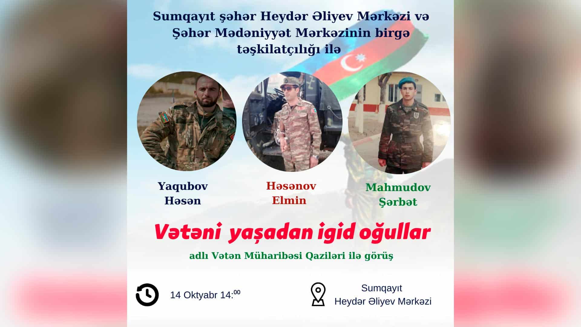 "Vətəni yaşadan igid oğullar” adlı tədbir 14 oktyabr saat 14:00-da Heydər Əliyev Mərkəzində təşkil olunacaq. Görüşdə qazilər: Elmin Həsənov, Həsən Yaqubov, Şərbət Mahmudov iştirak edəcəklər. Burada qazilərimizin həyat və döyüş yolları haqqında məlumatlar veriləcək, videoçarxlar nümayiş olunacaq. Qəhrəmanlar müharibə ilə bağlı xatirələrindən danışacaqlar. Bədii hissədə şairələr Xatirə Fərəcli, Fəridə Səxavət şeirlər söyləyəcəklər. Şəhid Rüfət Əhmədzadənin anası Ruhiyyə xanım çıxış edəcək. Eləcə də müğənnilərdən Əlipaşa Paşayev, Zaur Yusifli, Əli Əzizoğlu, Sevda Akkaya, “Veteranlar” xalq xoru vətənpərvərlik ruhunda mahnılar ifa edəcəklər.