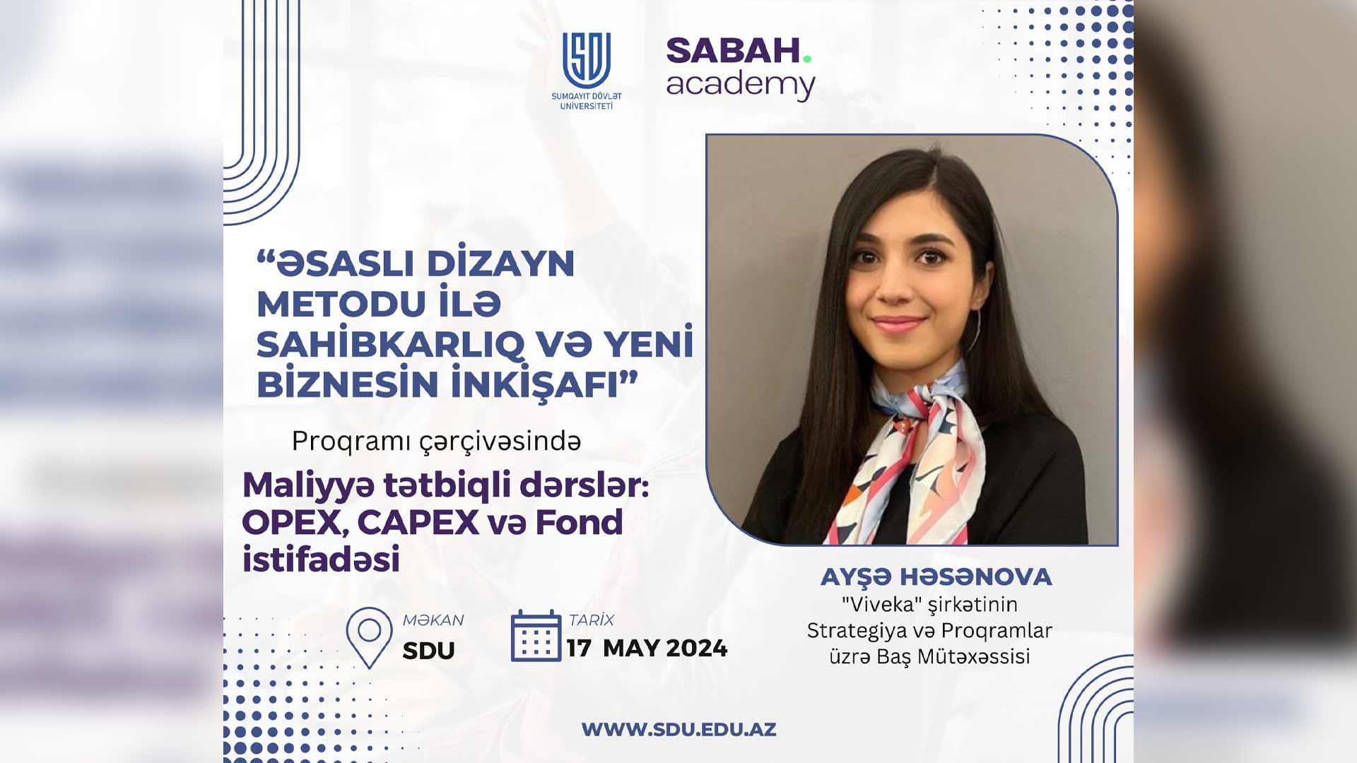 “Viveka” strateji innovasiya məsləhətçiliyi şirkətinin Strategiya və Proqramlar üzrə baş mütəxəssisi Ayşə Həsənova “Maliyyə tətbiqli dərslər: OPEX, CAPEX və Fond İstifadəsi” mövzusundan danışacaq.