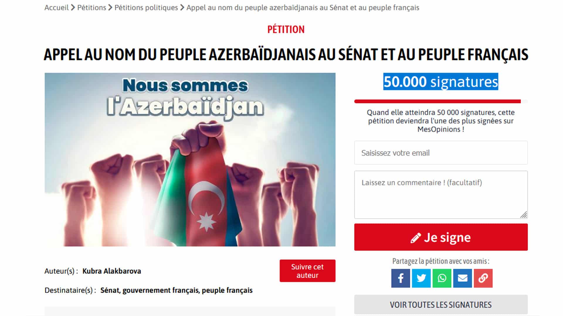 Oktyabrın 11-dən etibarən soydaşlarımızın Fransa Senatına ünvanlandığı petisiyaya səs verənlərin sayı 50.000-i keçdi.